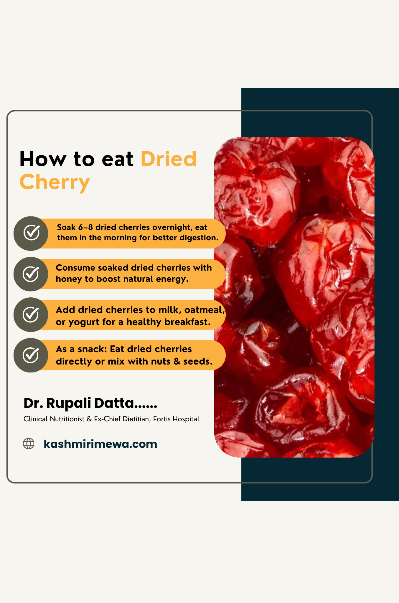 Dried cherries are not only delicious but also very healthy. They contain many nutrients that support overall wellness.